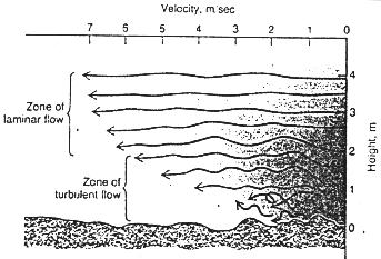 Wind velocity and the types of flow above the ground. The zone of turbulent flow is relatively thin and slow. Quelle nicht mehr bekannt.
