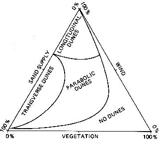 Diagram showing the relationship of the three main dune forms to vegetation, sand supply and wind. aus: Greeley, R. & Iversen, J.D. (1985), p. 160