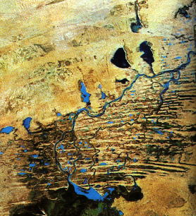 in Mali, zu sehen sind blaue bis blauschwarze Wasserflächen,