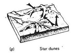 Im Gegensatz dazu sind die in Abbildung 8 g gezeigten Sterndünen (star dunes) spitze, mit speichenartigen Ausläufern versehene Dünen. Vor allem auf Luftbildern kann man die scharfen Grate der Ausläufer und die besonders auf sichtbaren mehreren "slip faces" der Arme erkennen. Die Sterndünen, auch Rhourds oder Oghurts genannt, entstehen durch Einfluß von mehreren Windrichtungen. Sie können Höhen von 300 Metern erreichen und mehr als 2 km Durchmesser haben. Je nach Windstrommustern und Sandnachschub können die Dünen sehr lange Arme oder sehr kurze Arme besitzen, oder, wie in der Namib, die Arme in einer bevorzugten Richtung ausgetreckt haben. Im Gegensatz zu den meisten anderen Dünen, scheinen Sterndünen nicht zu wandern. Tun sie es doch, so benötigen sie dazu aufgrund der verschiedenen Windrichtungen und ihrer Größe sehr viel Zeit.